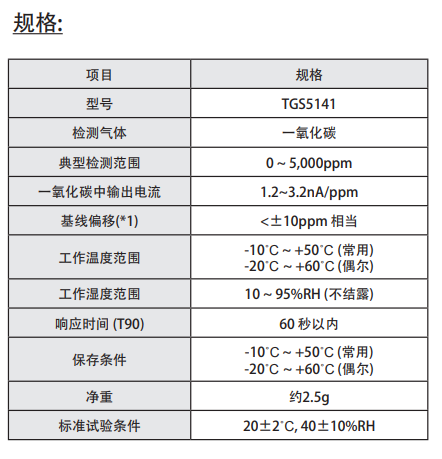 TGS5141是費加羅研發(fā)的可電池驅動的電化學式傳感器,使用一個特殊的電極取代了儲水器,由于去除了TGS5042中使用的儲水器,TGS5141與TGS5042相比,其外形尺寸縮減到只有后者的10%大小。超小型的體積使其可以成為諸如便攜式一氧化碳檢測儀、微型住宅一氧化碳檢測儀、多用途火災檢測儀的理想選擇。